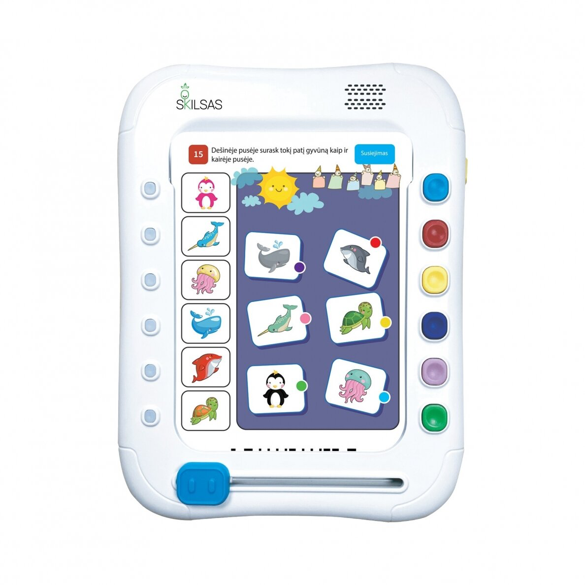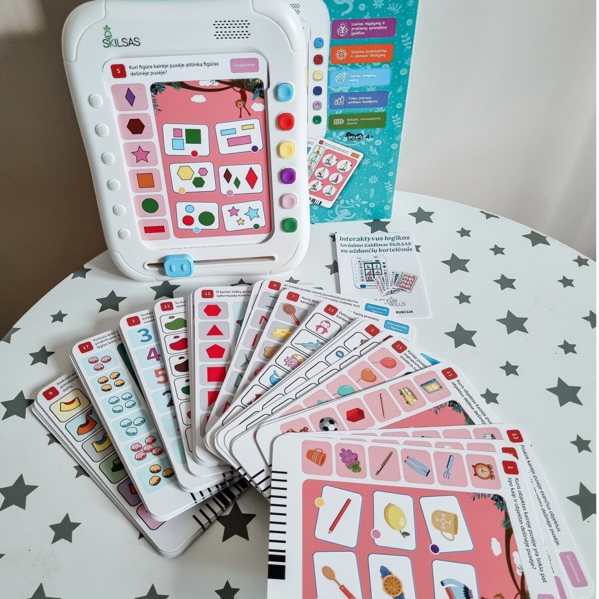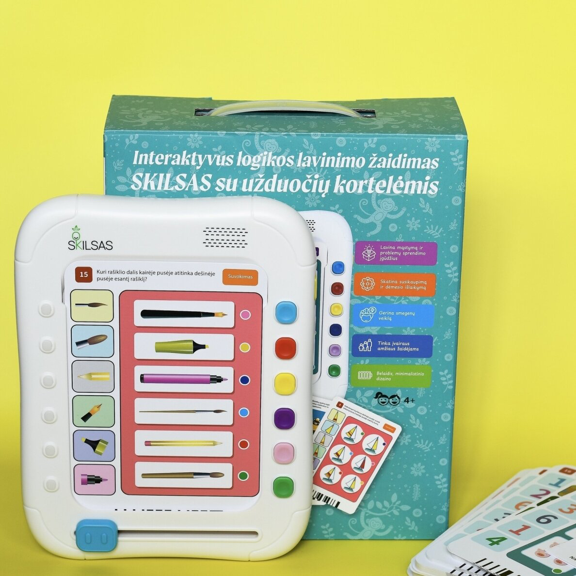 Tai labai universalus ir skirtingo amžiaus vaikams tinkantis prietaisas, kurio komplektacijoje yra net 720 skirtingų užduočių! Tereikia jį įjungti, įstatyti vieną iš kortelių ir slankiklį patraukti į dešinę pusę – vaikas išgirs instrukcijas, ką turi atlikti. Atlikus užduotį kortelę galima ištraukti, o slankiklį pastumti atgal, į kairę. Jei vaikas tą pačią kortelę įstatys į prietaisą priešinga puse ir slankiklį vėl pastums į dešinę – išgirs jau kitos užduoties instrukcijas. Labai patogu tai, kad vaikas girdi paskatinimus, pastabas ir patarimus, kurie padeda užduotis atlikti greičiau. Kortelėse integruotos užduotys yra atrinktos specialistų ir skatina mąstyti, rūšiuoti objektus ir ieškoti ryšių tarp skirtingų objektų. Kompiuterinius žaidimus ir laiką socialiniuose tinkluose keiskime į prasmingą ir įtraukiančią veiklą! Užduočių sprendimas interaktyviuoju kompiuteriu „Skilsas“ – tai žaidimai ir ugdymas arba 2 viename!