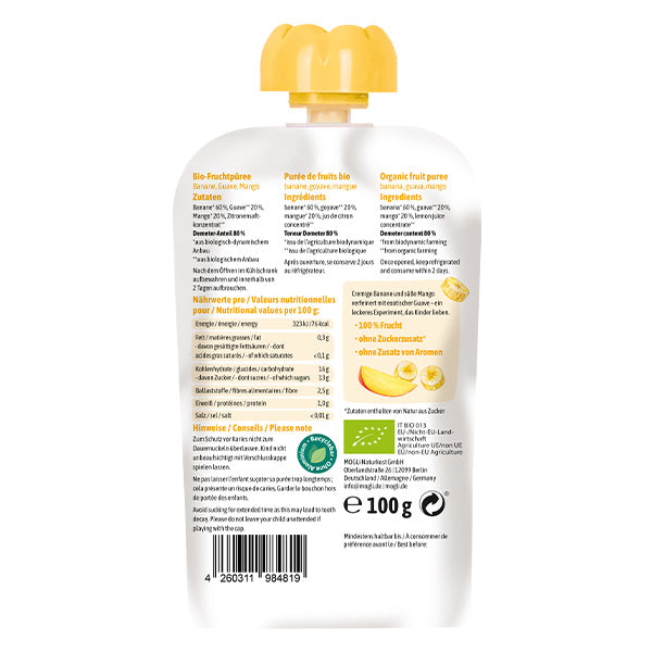 MOGLi ekologiškas vaisių tyrelės pakelis – mangų, guavos ir bananų
