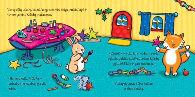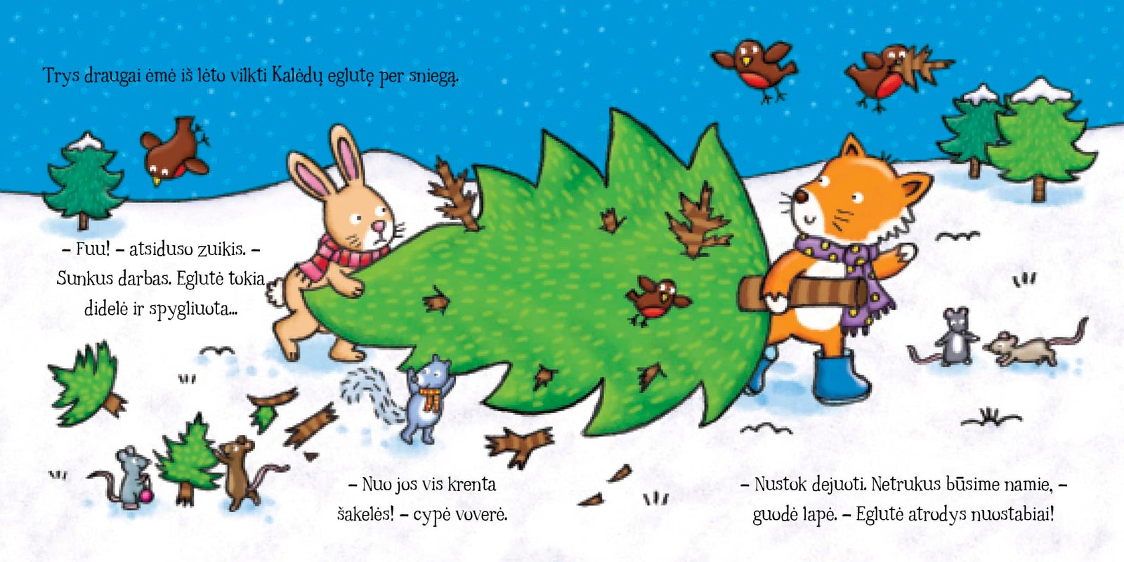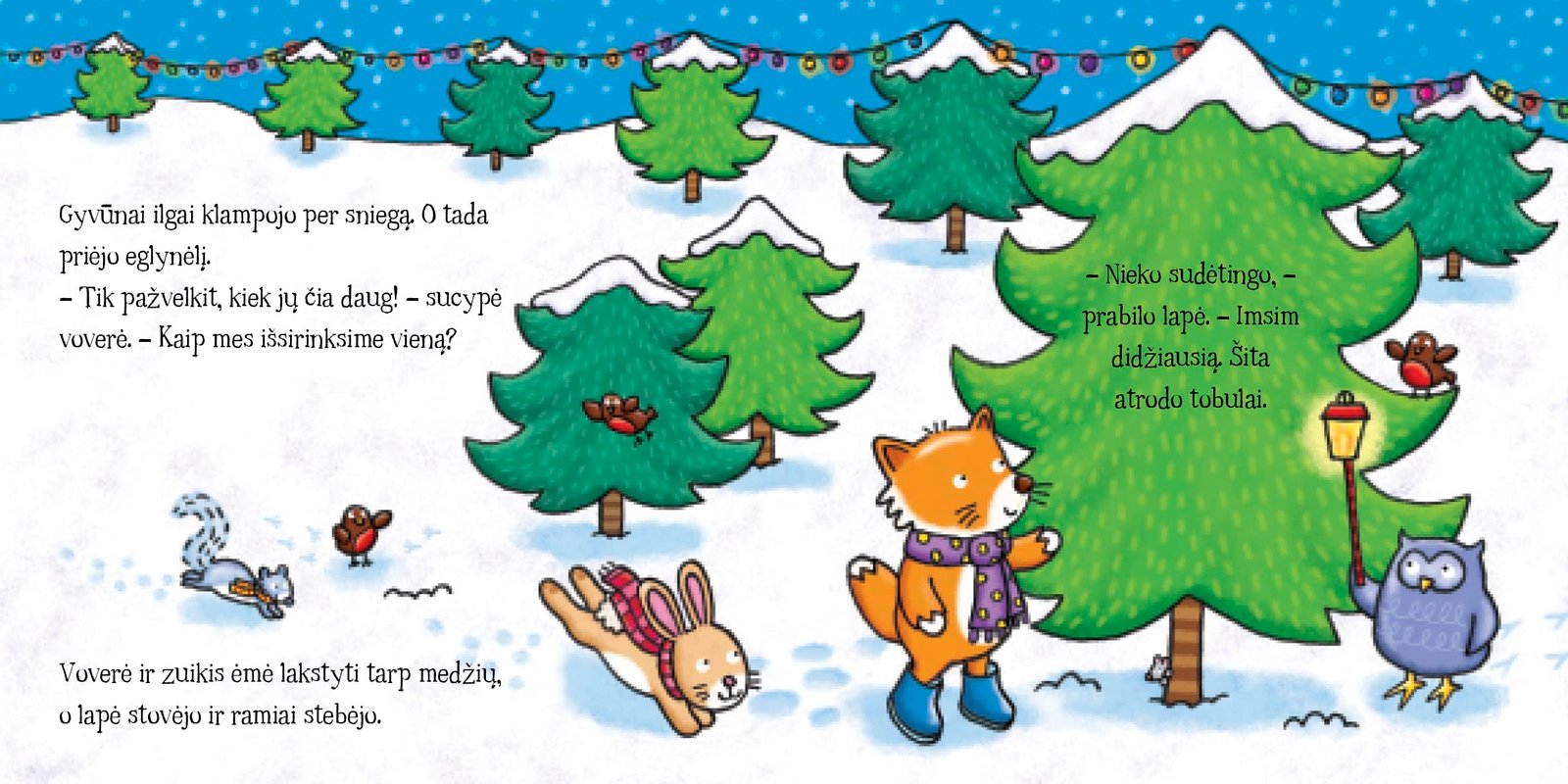 Lapė, zuikis ir voverė apsivynioja šiltus šalikus ir patraukia į mišką ieškoti didžiausios Kalėdų eglutės.