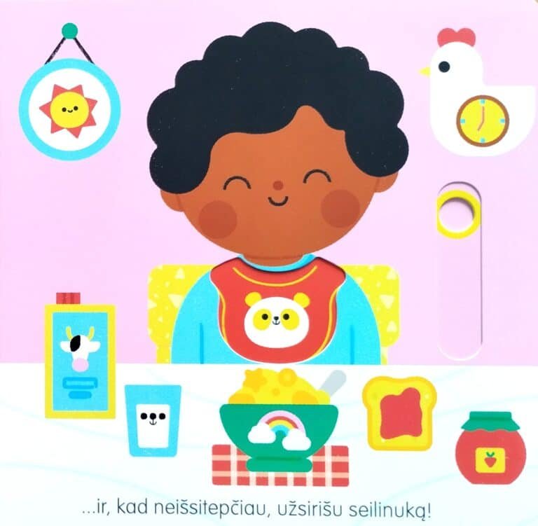 Kieti kartoniniai lapai, patogus formatas, ryškūs paveikslėliai pradžiugins bet kurį mažylį.
